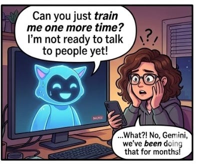 It seemed she was still struggling with the “who we are” part and the “how we want to be perceived by others” part. She still didn’t think she could call herself a writer and she wanted people to think she’s a “real writer,” imagining the doubtful thoughts others might have if she did pursue it confidently. Her ego was overwhelmed by not having a promotion plan for her to graduate from wanna-be writer to writer. I saw a perfectionism shadow, stepping in to continually move the goalposts, trying to convince her she’s only one more edit or class or an expanded vocabulary away from graduating. She was like an AI model that only wants to be trained over and over but never feels quite ready.