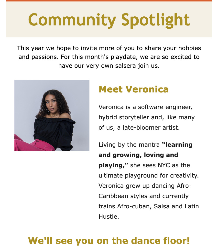The medium is… community. Last weekend, I cohosted a beginner salsa class with Let’s Play NYC. It was an immediate hell yes when the founder, Sahara, reached out to collaborate. I’ve admired what the organization stands for: adult play. Let’s Play encourages us to remember what it’s all for, to move our bodies, to connect with others outside of the usual bars and coffee chats. And what better way to celebrate the last day of Black History month than to honor a dance that black people made? I was grateful when Sahara agreed to me teaching a mini history lesson on salsa’s afro roots before we got to grooving. If you want the “book report” I made when studying salsa’s history, let me know in the comments.